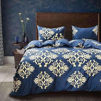 غطاء لحاف Cozyholy فاخر بتصميم الباروك غطاء لحاف بتصميم بوهيمي عتيق ناعم للغاية بسحاب أنيق طقم سرير مكون من 3 قطع الملكة أزرق داكن نمط الباروك الذهبي الفاخر اشتري اون لاين