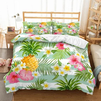 جزيرة الاستوائية الفراش الأناناس الأبيض الوردي الزهور الخضراء يترك الأبيض الأزرق المشارب 2 3 قطعة مجموعة غطاء لحاف أغطية سرير الفاكهة مجموعة Leather Bag