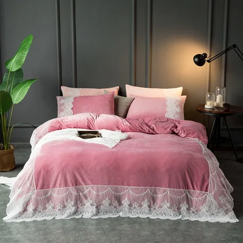 مجموعة مفروشات سميكة للشتاء من الفلانيل باللون البني والوردي والأزرق والأصفر وأبيض من الدانتيل والصوف وغطاء لحاف من القماش وملاءة السرير أغطية وسادات من الكتان مجموعات الفراش Aliexpress