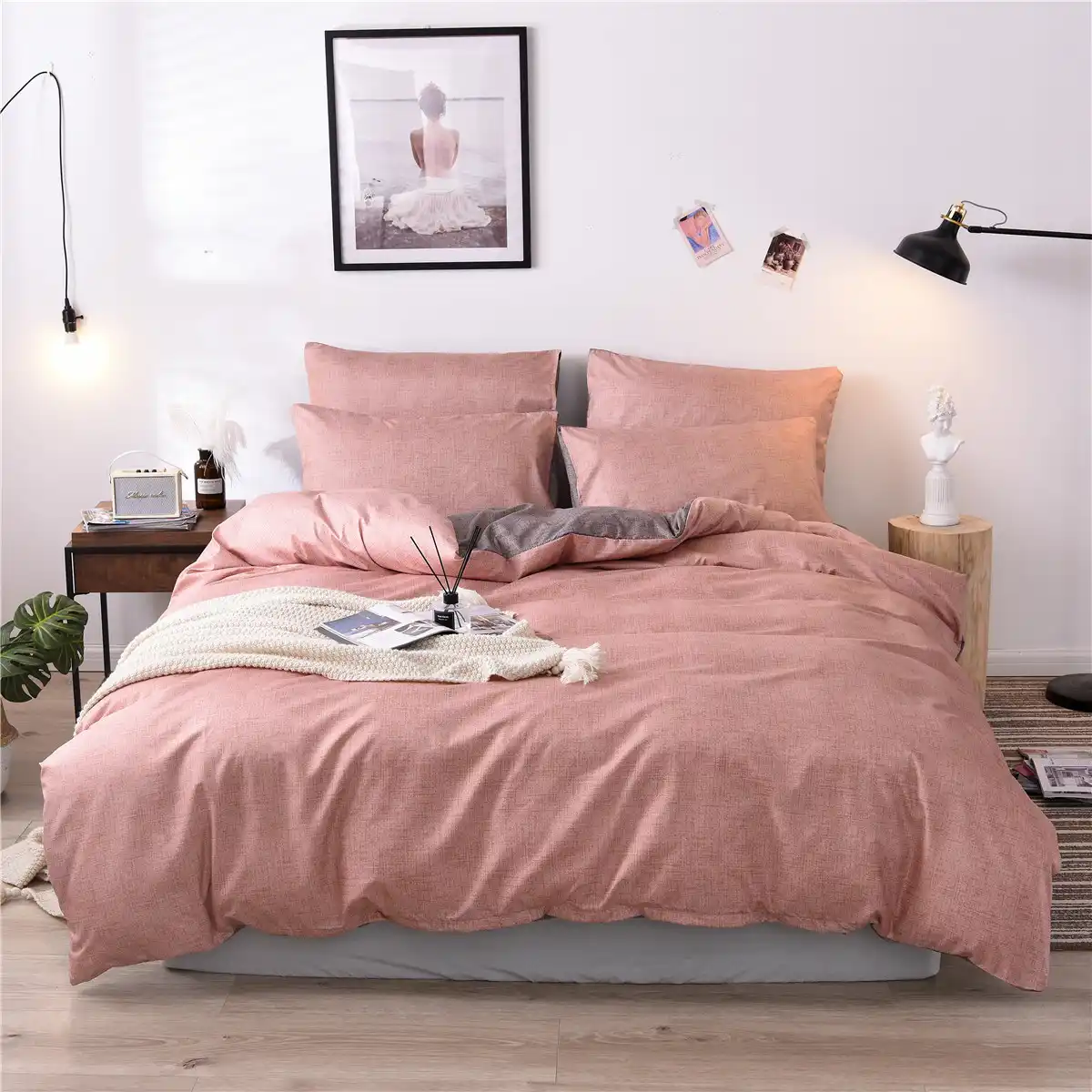 طقم أغطية لحاف وردي ورمادي Ab نسيج جانبي مطبوع لون عادي طقم سرير واحد سادة مقاس كبير غطاء المعزي المخدة Leather Bag