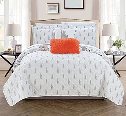 طقم لحاف 5 قطع ذو وجهين من Chic Home New York تصميم مطبوع مستوحى من المدينة وسائد مزخرفة مايكرو فايبر كحلي Queen Amazon Ae