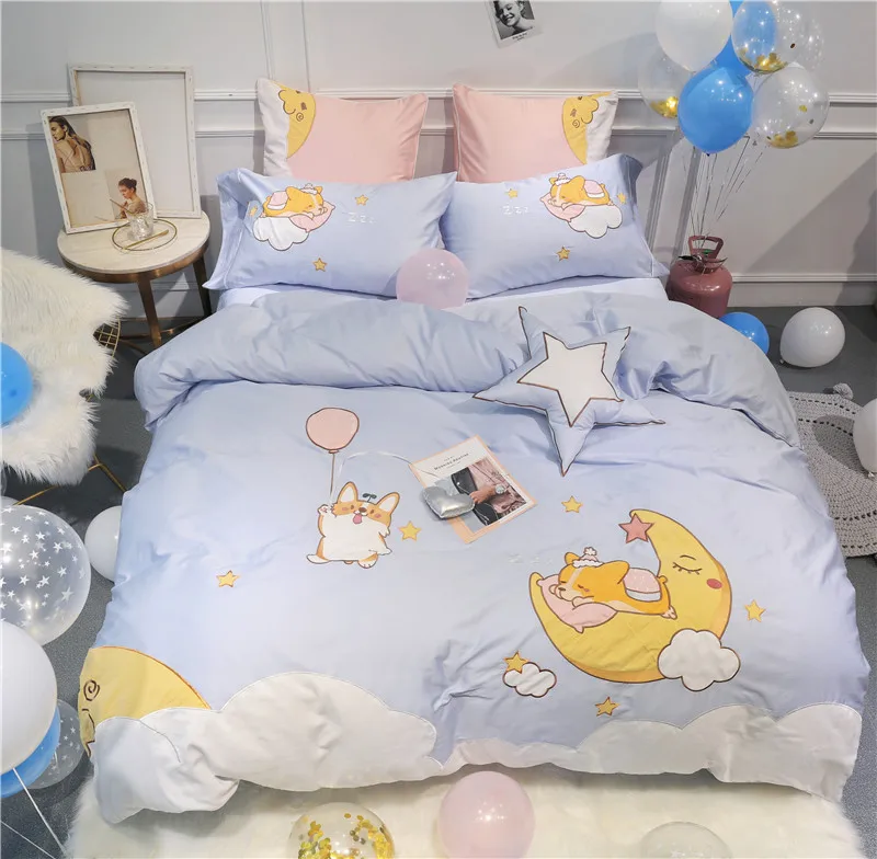 الأزرق الوردي الكرتون كورجي القمر التطريز القطن المصري فتاة الطفل طقم سرير حاف الغطاء غطاء سرير أغطية سرير المخدة 4 6 قطعة Aliexpress