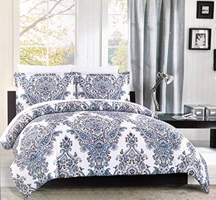 طقم أغطية لحاف من Nicole Miller 3 قطع من القطن King غطاء لحاف منقوش بنقوش أزهار جاكوبي بنقوش بيزلي باللون الأزرق والبني والبيج على خلفية زرقاء داكنة تيل King Amazon Ae