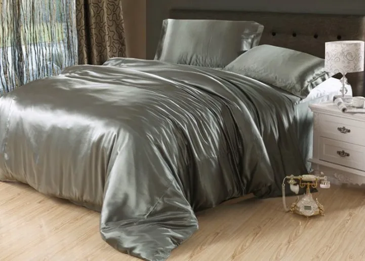 فضي رمادي طقم فراش من الحرير الساتان ملاءات سوبر الملك الحجم الملكة مزدوجة غطاء لحاف ريش المفارش أغطية سرير ماركة ملاءات Linen Bedsheet Silk Bedding Setking Size Aliexpress
