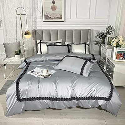 طقم سرير من الساتان الجاكار مطرز بلون سادة مجموعة سرير مزدوجة الوجهين تصميم الدانتيل جودة الفنادق تتضمن غطاء لحاف وملاءة ملائمة ناعمة وخفيفة الوزن فضي 150 200cm Amazon Ae