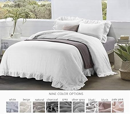 طقم اغطية لحاف من الكتان الفرنسي المغسول ستون قطعتين أو 3 قطع سوبر النعومة مقاس Twin Queen King نمط مكشكش قفل بأزرار ربطات الزوايا أبيض ووردي ورمادي كتان ابيض Queen Amazon Ae