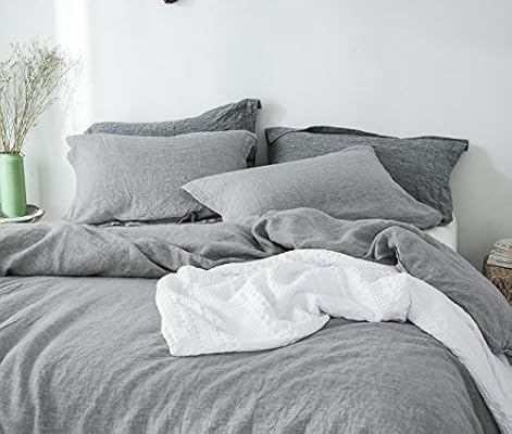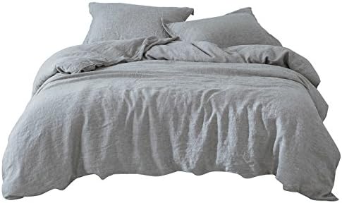 مجموعة أغطية لحاف من الكتان الفرنسي 100 من بي إف إف 3 قطع فاخرة فاخرة جيدة التهوية مع زر إغلاق كتان رمادي فاتح Queen Size Amazon Ae