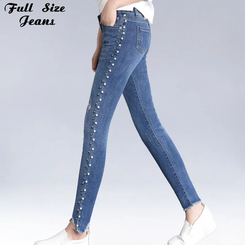 الصيف حجم كبير نحيل الجانب اللؤلؤ الديكور الأبيض غسل Capris الجينز 4xl 5xl الضوء الأزرق تمتد الدنيم السراويل النساء بناطيل كاجوال في جينز من ملابس نسائية على Deal Unohama Club Store