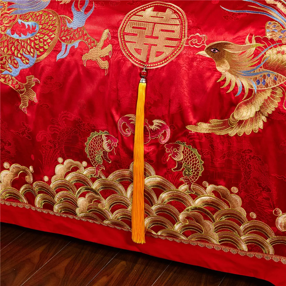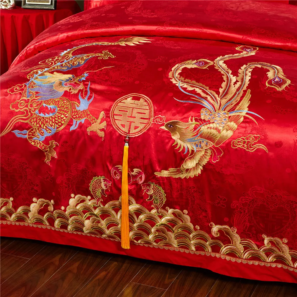 الصينية الزفاف الأحمر طقم سرير الفراش الآسيوية مع التنين و طائر الفينيق التطريز حاف طقم أغطية 6 قطع 100 القطن الملك Red Bedding Asian Beddingduvet Cover Set Aliexpress