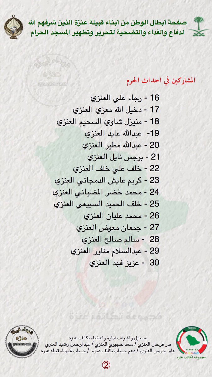 حساب تكاتف عنزه V Twitter صفحة ابطال الوطن من ابناء قبيلة عنزه الذين شرفهم الله لدفاع والفداء والتضحية لتحرير وتطهير المسجد الحرام في عام 1400 هـ تكاتف عنزه احداث الحرام Https T Co Pfyfuwmamo