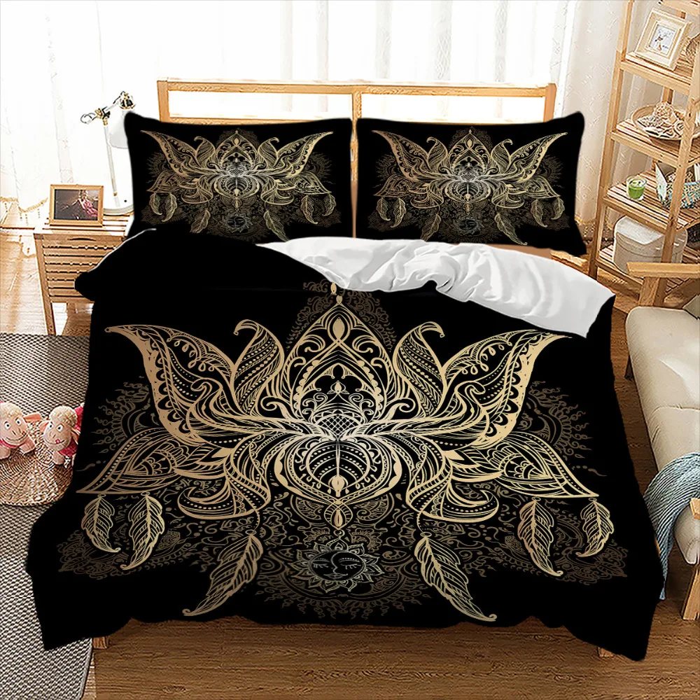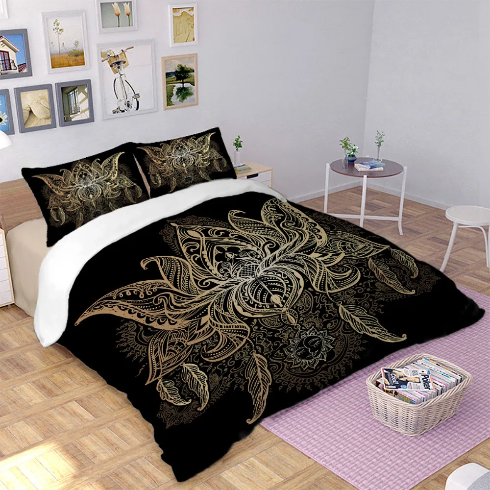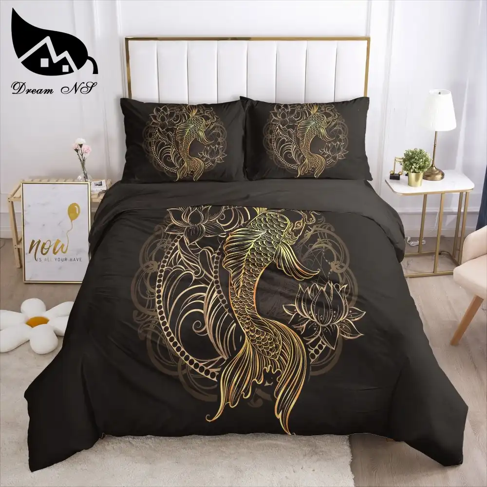 Hot Deals Wongs الفراش الذهب اللوتس لحاف لتغطية الفراش مجموعة أسود غطاء لحاف طقم سرير 3 قطعة جديد في مجموعات الفراش من المنزل والحديقة على مجموعة Ar Ukmkita Co Store