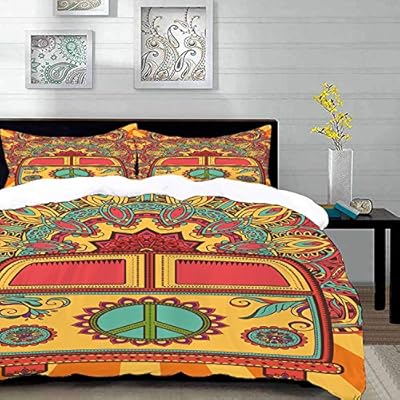 مجموعة الفراش 70s Party Hippie Vintage Mini Van الزخرفي خلفية مع السلام تسجيل العمل الفني المرجان البرتقالي الفيروز غطاء لحاف واحد وسائد 50 80 سم Amazon Ae