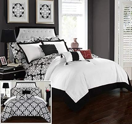 10 قطع من Chic Home قطعة Tania باللون الأسود والأبيض يلبس على الوجهين مجموعة فندقية نسيج من مجموعة King ملاءة سرير بداخل حقيبة باللون الأسود مع مجموعة اللحاف Black Queen Amazon Ae
