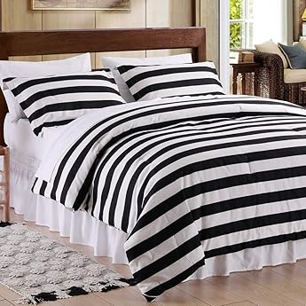 طقم لحاف كوين هاوس مخطط باللونين الأسود والأبيض مقاس كوين سرير في حقيبة 8 قطع لحاف بديل ناعم لأسفل طقم فراش داخلي محشو من الألياف الدقيقة طقم لحاف مجموعة ملاءات سرير تنورة