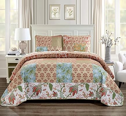 مجموعة ملاءات سرير مبطنة كبيرة الحجم من كافر لحاف مزخرف باللون البيج الصدأ والأزرق الفاتح والأخضر والأبيض الجديد King Cal King Quilt Amazon Ae