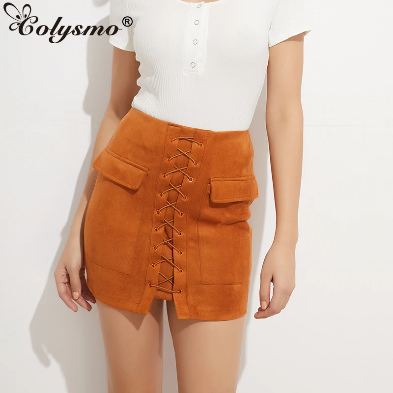 Colysmo تنورة جلد الغزال خمر عالية الخصر تن ورة مجس مة الشتاء جيب خارجي فو الجلود التنانير النسائية الخريف تنورة صغيرة Saia New في تنانير من ملابس نسائية على Agustinosgranada Club Store
