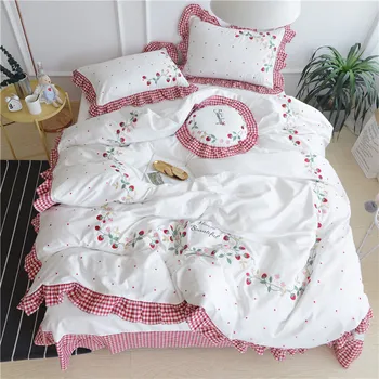 الأبيض الوردي التطريز الفراولة لطيف الفراش مجموعات الفتيات الملك الملكة حجم غطاء سرير مجموعة 5 قطع غطاء لحاف الكتان مجموعة وسادة يغطي Leather Bag