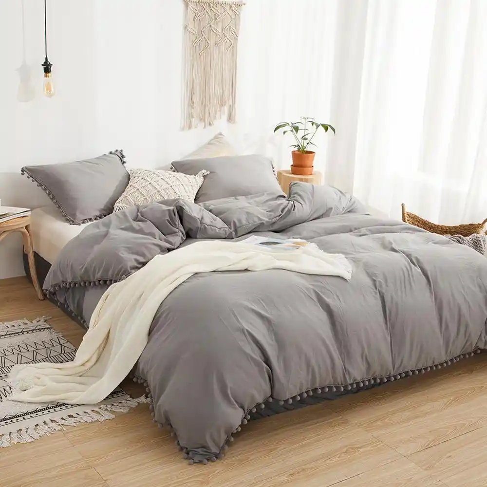 رمادي فاتح الفراش بوم بوم حاف مجموعة غطاء هامش الكرة المنسوجات المنزلية فراش بلون واحد مجموعات لينة لحاف من الميكروفيبر غطاء Aliexpress