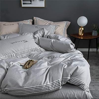 مجموعات غطاء لحاف من القطن الهندسي 4 قطع من أغطية السرير المزغبة ملاءة مسطحة 2 أغطية وسائد مخططة مطرزة قطن رمادي فاتح Queen Amazon Ae