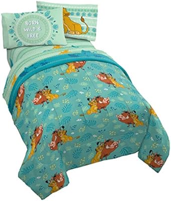 مجموعة سرير كاملة من 5 قطع مرحة إن ذا صن من ديزني ليون كينج تتضمن طقم لحاف وملاءات سرير بوجهين مزايا السرير سيمبا بومبا تيمون ألياف دقيقة فائقة النعومة