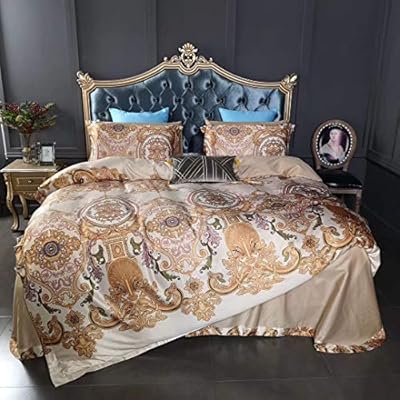 مجموعات أغطية لحاف مطرزة فاخرة مجموعة فراش من الساتان الجاكار من القطن الحريري الرومانسي النبيل طباعة دانتيل حريري ناعم 4 قطع أغطية وسائد غطاء لحاف زهري King Amazon Ae