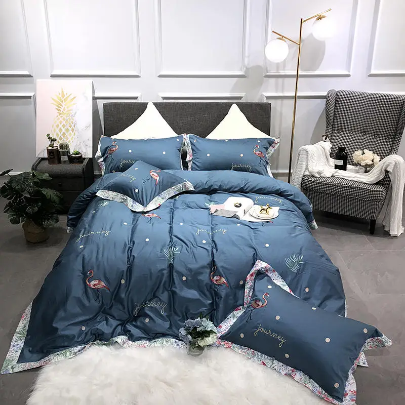 100 القطن المصري 4 قطع فلامنغو التطريز حاف مجموعة غطاء البحرية الأزرق الملك الملكة حجم طقم سرير غطاء سرير وسادة شمس مجموعات الفراش Aliexpress