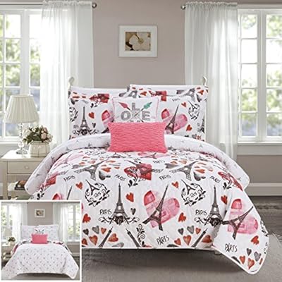 طقم لحاف ذو وجهين من Chic Home Grand مقاس 5 قطع Paris Is Love مطبوع بتصميم مستوحى من الحب غطاء سرير مزخرف يتضمن أغطية للوسائد مايكرو فايبر زهري Queen Amazon Ae