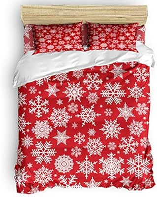 مجموعة غطاء لحاف رائعة من نسيج قطني مضلع مجموعة ملاءات سرير مريحة وسهلة التنظيف مجموعة مفارش زينة ندفة الثلج باللونين الأحمر والأبيض تتضمن 1 غطاء لحاف 1 ملاءة سرير و2 كيس وسادة