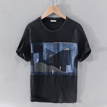 جديد وصول قصيرة الأكمام المطرزة الكتان تي شيرت للرجال موضة الأسود تي شيرت رجالي عادية مريحة تي شيرت الذكور Overhemd Leather Bag