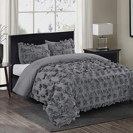 طقم لحاف 3 قطع من هاي قماش مايكروفايبر مزين بزهور وندرد بورترفلاي مجموعة ملاءات السرير من انفيلد ناعم ولا يسبب الحساسية مقاوم للبهتان 2 غطاء معياري رمادي Queen Amazon Ae