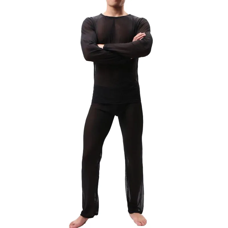 Hot Deals ملابس داخلية للرجال مثيرة وشفافة رقيقة من Kwan Z Pijama Hombre ملابس نوم بيجامات بأكمام طويلة طقم ملابس مريحة من القماش الشبكي للرجال في أطقم بيجامات للرجال من ملابس داخلية وملابس